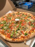 Pepperoni, sausage, meatballs, mushrooms, peppers & onions over a light layer of tomato sauce with a sesame crust